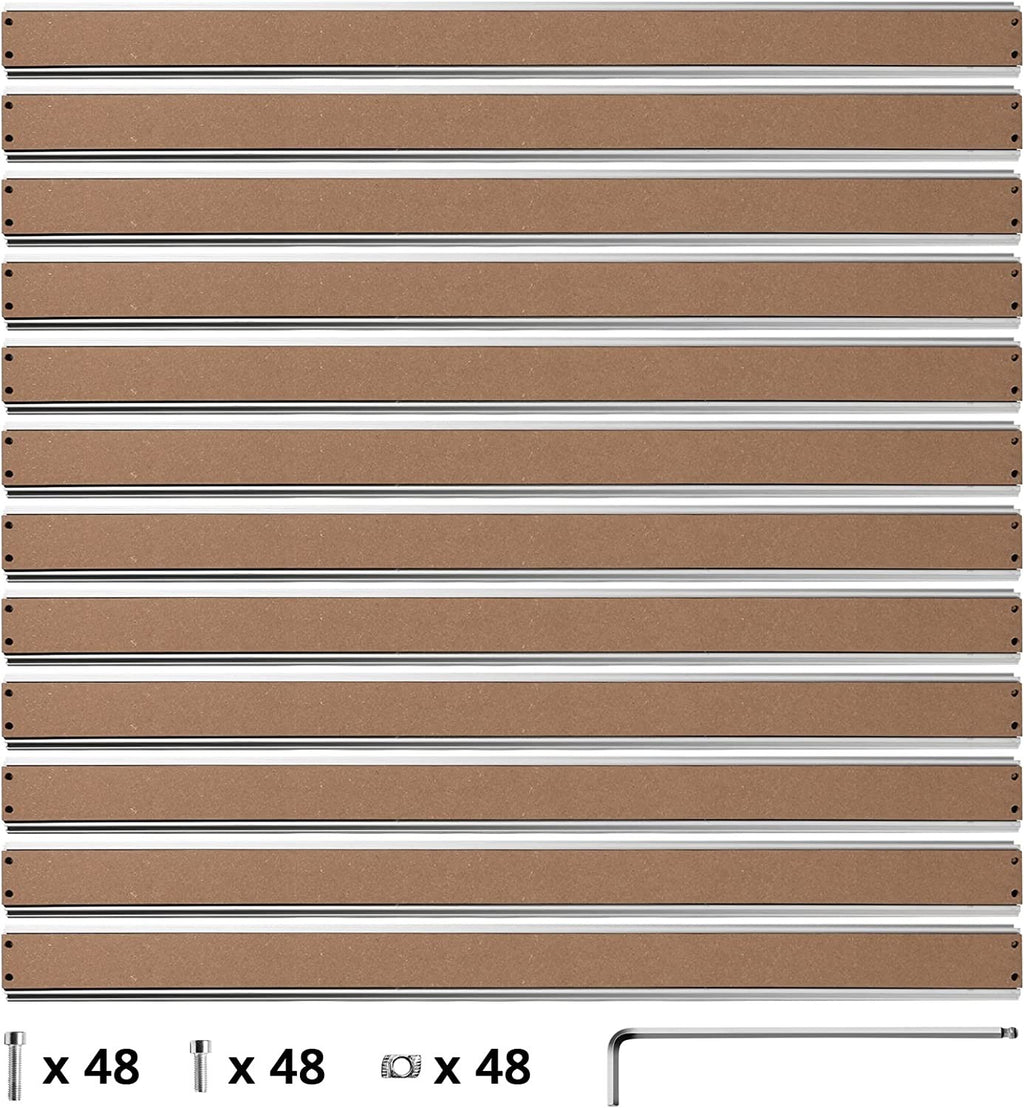 Made of high strength aluminum alloy and easy to replace MDF slats. The durable aluminum T-track grid extrusions support the MDF slats for a rigid and level surface.