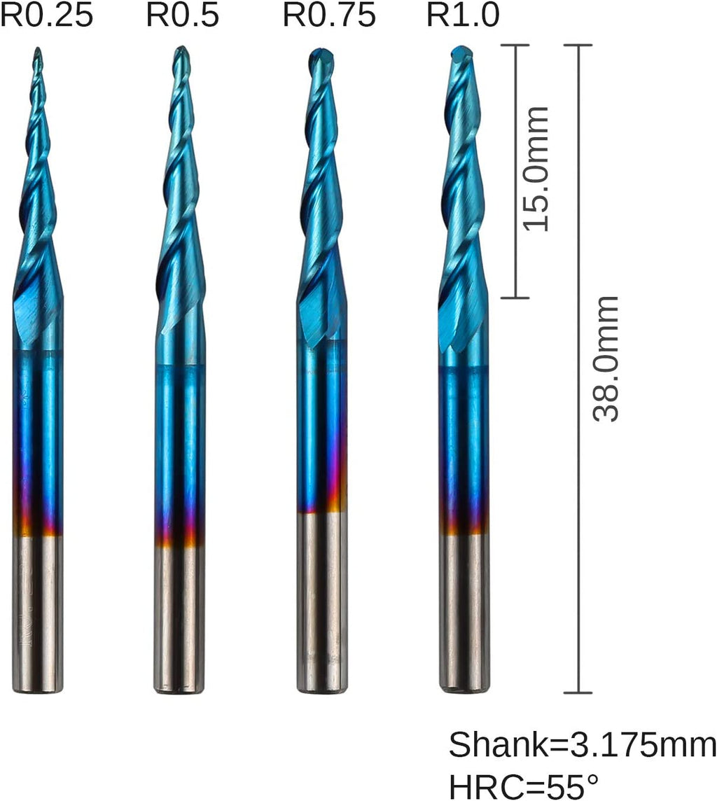 Cost-Effective: Coming with 4x 2-Flute tapered ball nose end mills, Shank Diameter: 3.175mm, Radius: 0.25, 0.5, 0.75, 1.0mm, Cutting Length: 15mm, Overall Length: 40mm.