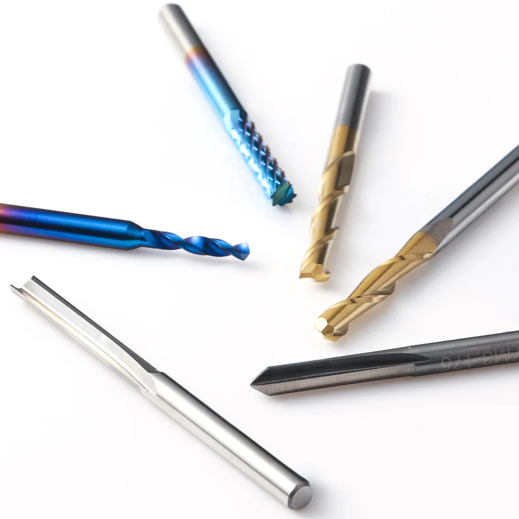 Rich Sizes for Choose: 2-Flute Flat Nose & Ball Nose End Mills, 2-Flute Straight Router Bits, and Nano Blue Coating End Mills -- Cutting Diameter: (1-3.175mm). PCB Drill Bits -- Cutting Diameter: (1.1-2.0mm).