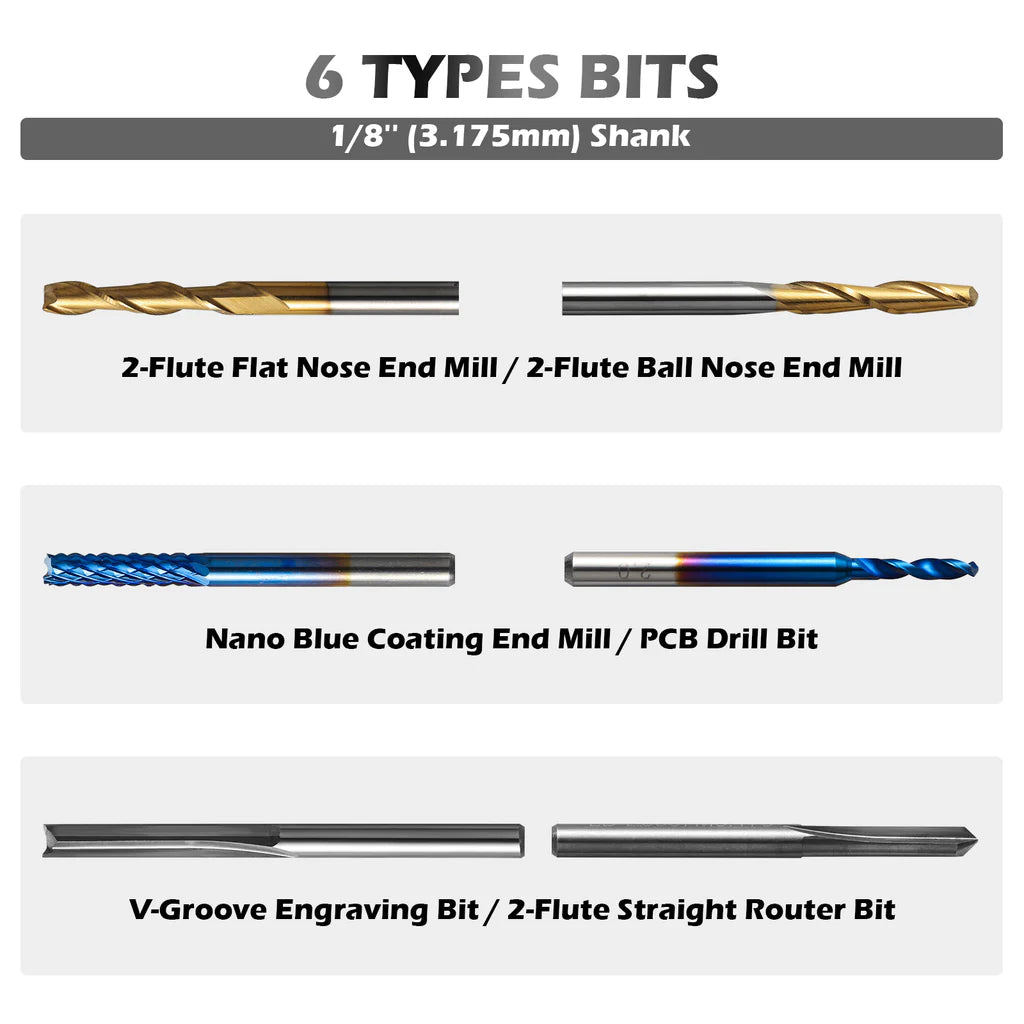 Mixed Router Bit Set: 6 kinds of bits in this router set, which include 10pcs 2-Flute Flat Nose End Mills, 10pcs 2-Flute Ball Nose End Mills, 10pcs Nano Blue Coating End Mills, 10pcs PCB Drill Bits, 5pcs V-Groove Engraving Bits, 5pcs 2-Flute Straight Router Bits.