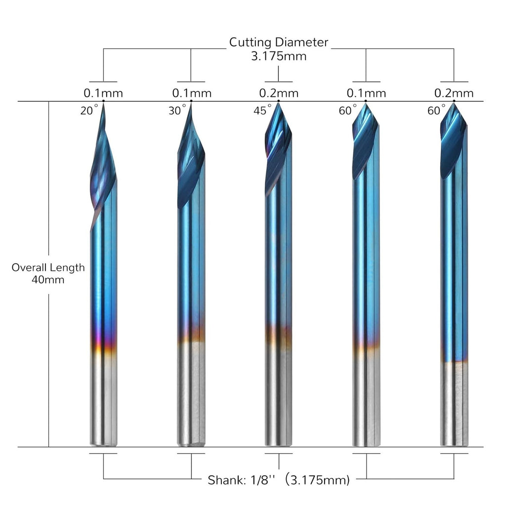 Cost Effective: The V shape bits are good at letting and sign making. This set of V-Groove CNC Router Bits includes 4 different degrees (20, 30, 45, 60), which is commonly used in 2D engraving and 3D sculpting.
