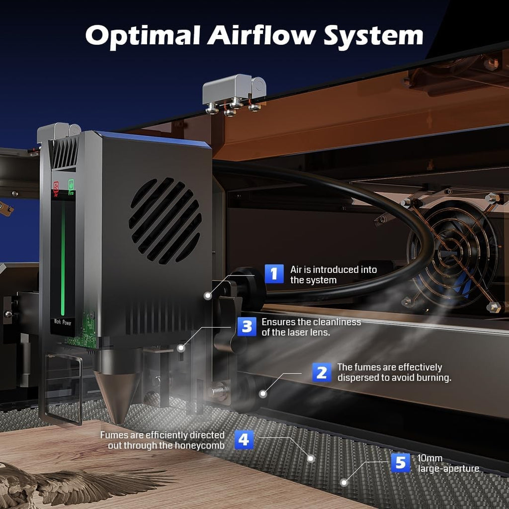 Say goodbye to multiple trials and errors: equipped with a Lightburn-compatible camera, positioning your project is a breeze. Plus, with a power indicator bar, fault reporting light, and airflow detection, this machine puts you in control.