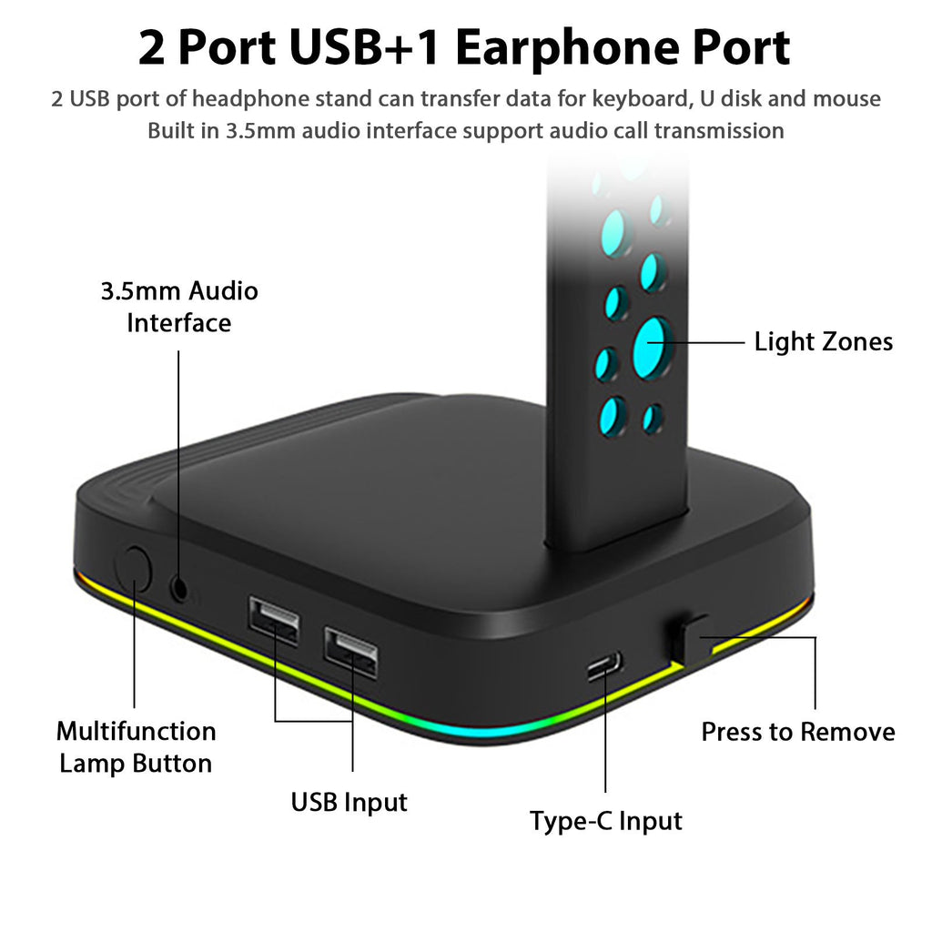 ⭐【2 Port USB+1 Earphone Port】⭐ The game headset stand cord is 140cm/ 4.59 ft long,which can transfer data or charge your mobile phones,tablets,E-readers,headphones and other USB devices (such as chargers,U disks,mini electric fans etc.) ,plug and use, indirectly add USB ports to your computer