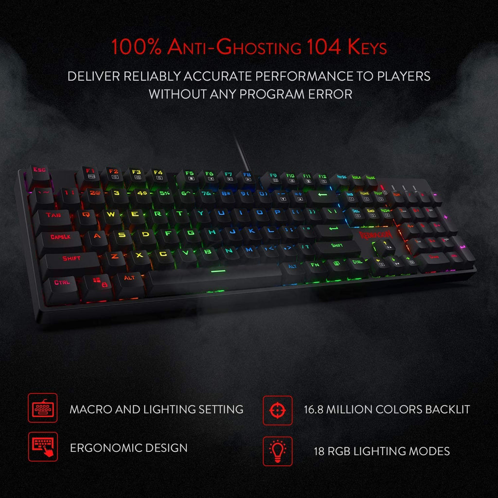 N-KEY ROLLOVER: 100% anti-ghosting 104 keys ensure the most accurate simultaneous key presses. Fully programmable - Reassign any key or set up the most extreme macros for effortless gaming.【No CD software included, please download software from https://www.redragonshop.com/pages/software】