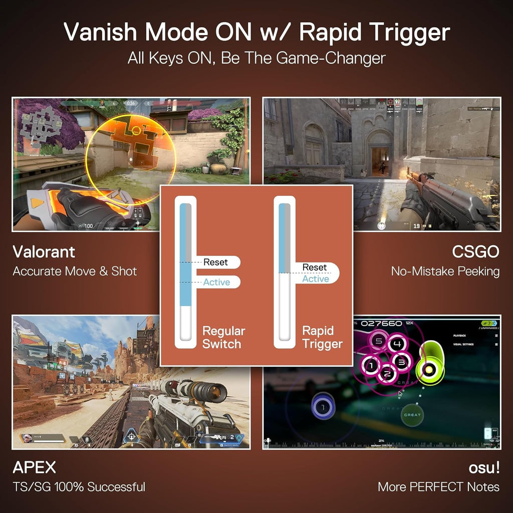 Speed Is Everything - Differing from other traditional mechanical switches, K683 M with Hall magnetic switch eliminates the physical input delay and offers 10x fast and 2x longer lifespan, which makes you the mighty THOR controlling the lightning to vanish the opps.Rapid Trigger Tech - Combine the Hall magnetic switch with rapid trigger ON via software, the actuation point can be 0.1mm precision adjusted between 0.3-4.0 mm (The actual effect of the 0.1-0.2 mm actuation point may be affected by the normal tolerances of the components), ultra-precise actuation point combo with dynamic activation/deactivation defines your one-tap-kill.8K Hyper-Polling - REDRAGON’s most advanced gaming keyboard gears the native 8,000Hz hyper-polling response. Quickly connected with a detachable USB-A to USB-C cable to transmit inputs up to 8x faster (0.125ms lowest latency), always gets pre-acted in the game.2 Actions In 1 Tap - K683 M professional software also allows two different movements assigned in one key by different key actuation pressure, enabling you to punch out 2 styles with only one tap and simplifying the complex skills combo at max.What Game Needs It - To be honest, all games that pursue timing, precision, and instant action need it. Valorant, helps with accurate moves and stopping to take the headshot. CSGO, makes the perfect peeking behind the wall and shoots advantagely. APEX, gets untrackable TS/SG movement 100% successful. and osu!, more PERFECT notes out.Make The Win Count - Due to the unique Hall effect triggering mechanism of the magnetic switch, the K617 requires a dedicated PC (Windows) driver to fully unlock its potential. Therefore, the magnetic switch is not compatible with Mac and non-PC platforms like PS5 and NS. If you do not intend to use magnetic switch feature, you can get a KB converter (not recommended, fairness makes the game enjoyable).