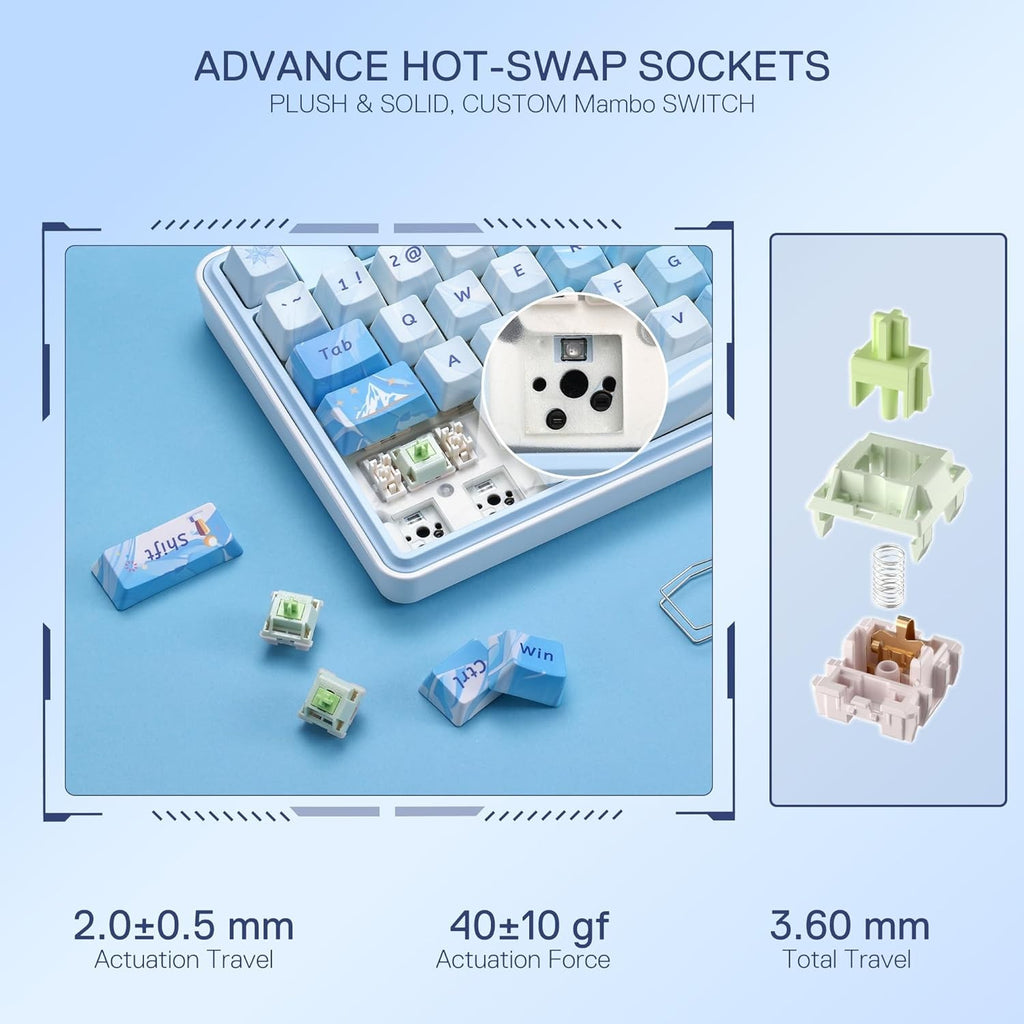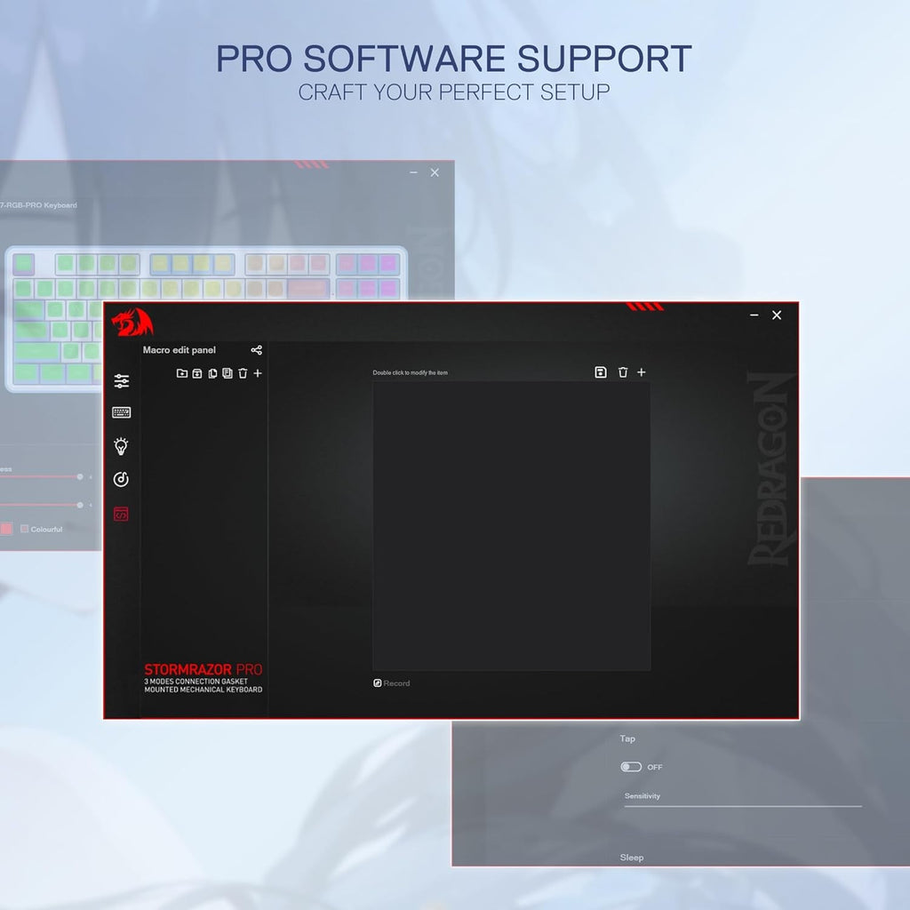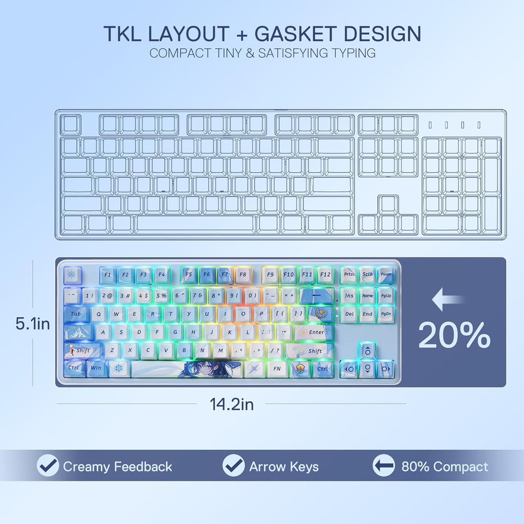 Redragon Anime Girl OUT - Here comes the adorable and reliable ally of Redragon, personalized waifu character Eisa reporting! 5 sides Dye-Sub PBT keycaps covered with themed patterns and elements offer unparalleled touch and vibe.CREAMY GASKET - The body structure differs from traditional screw fixing by using precision-locked covers with gaskets to assist with noise reduction and flexibility. It provides even feedback while the vertical cushioning reduces rigid noise, delivering a crisp, clean and softer typing feel.3-Mode Connection - Geared with Redragon advanced tri-mode connection technology, USB-C wired, BT 3.0/5.0 & 2.4Ghz wireless modes which make the user experience upgraded to another level in all fields.Noise Dampening x 5 - Equipped with 3.5mm PO foam, IXPE switch foam, PET sound pad, bottom socket foam, silicone bottom pad along with the silicone gasket. Significantly reduce the hollow noise, creating dampened and ultra-clean typing acoustics, making each keystroke satisfying and comfortable.Custom Mint Mambo Switch - With thick-lubed custom linear switches combo with a gasket form factor, K707 features cushioned rich linear travel with silky creamy and cozy typing feedback. The brand new upgraded socket is nearly all switches(3/5 pins) compatible.80% TKL Form Fact - K707 tenkeyless features an 87 keys layout design, cutting loose the numpad for more mouse-moving space. Original gasket structure and board material in a compact 80% layout design, crafted for FPS gamers.Pro Software Supported - Expand your options using the available software to design your own new modes and effects found on redragonshop. Macros with different keybindings or shortcuts for more efficient work and gaming.