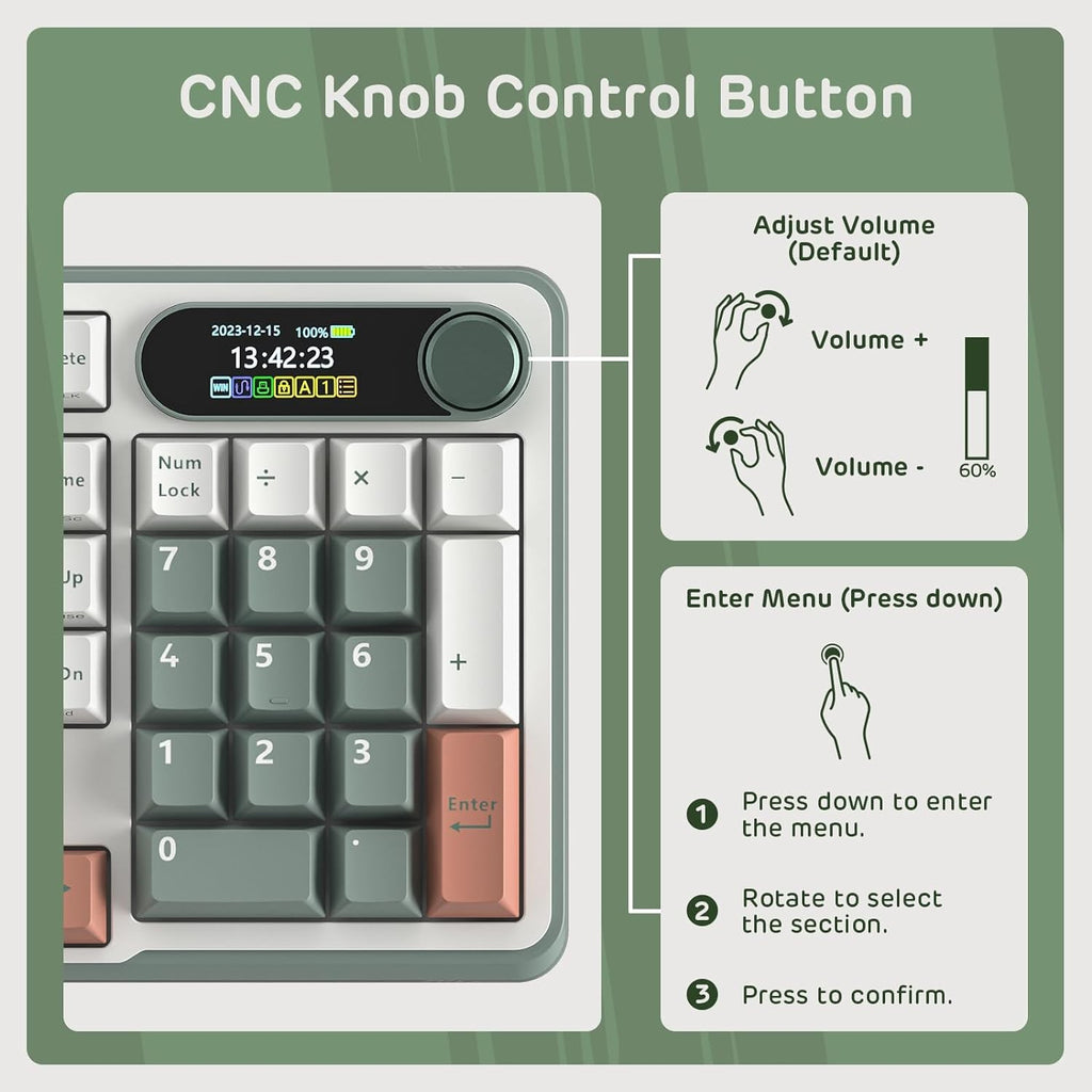 Big Features on a Small Screen - Is there anything it can't display? Custom gif image, date. connection mode, WIN/MAC layout, battery status, etc.Knob Design- Adjust volume, connection mode, backlit brightness/speed, RGB mode/color, all it takes is just a twist or a click.BT5.0/2.4G/USB-C - Wireless keyboard with stable BT 5.0, hassle-free 2.4Ghz dongle plus USB-C wired mode set no limits about your keyboard connection.Gaming Friendly Top-Mount Design - Offers a superior tactile consistency, firm feeling, and better noice reducing creamy keyboard.Sound Absorbing Foams - Equipped with IXPE switch dampener pad, 2 layers of thicker sound-absorbing foams, silicone dampener pad, which reduces 40% noise and removes 80% hallow sound. Bringing creamy or thocky sounding, natural and clear feedback, no more cavities noise.Hot swappable mechanical keyboard - Hot-swap PCB allows you to replace 3 pins/5 pins switches freely without soldering issue. Enjoy the fun of making your own unique keyboard.Double-shot PBT Keycaps - Provide superior fingertip feel, never-fading letters and exceptional durability.