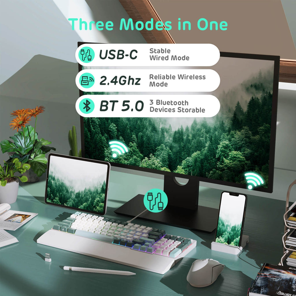 BT5.0/2.4G/USB-C - Believe it or not, this is the first generation of three-mode wireless keyboards on the market. Wireless mode with stable Bluetooth 5.0, hassle-free 2.4Ghz dongle plus USB-C wired mode set no limits about your keyboard connection.