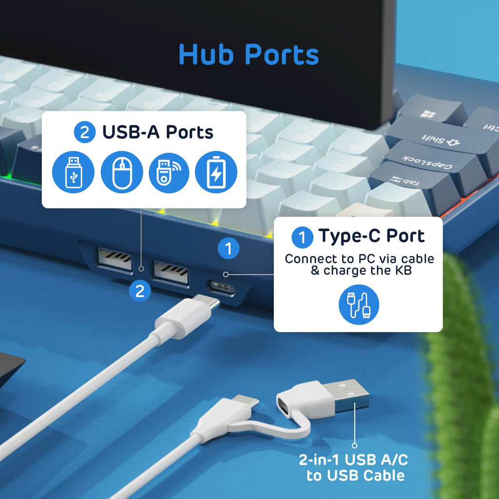 Hub Design - This wireless mechanical keyboard is armed with 2 built-in USB pass-through ports and 1 Type-C Port, allowing to back up more facilities, like a mouse or a headphone.