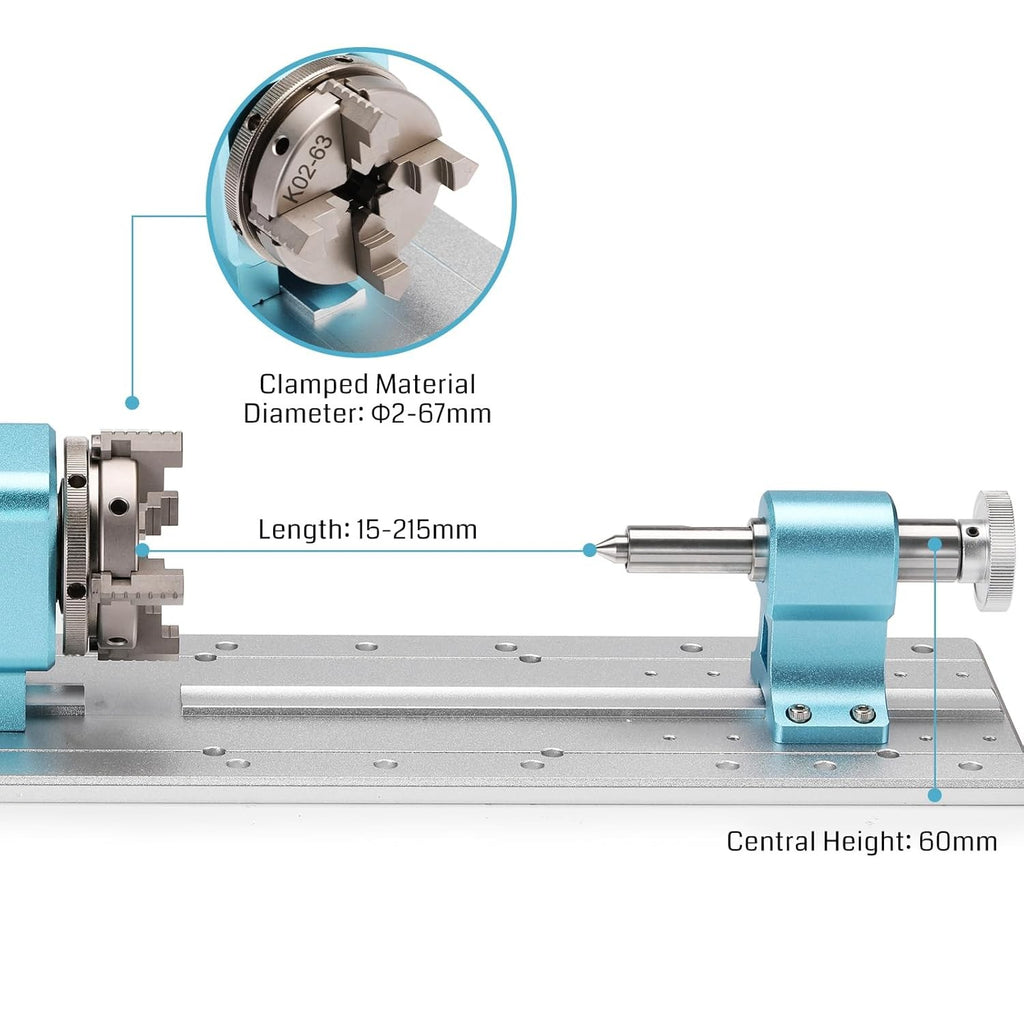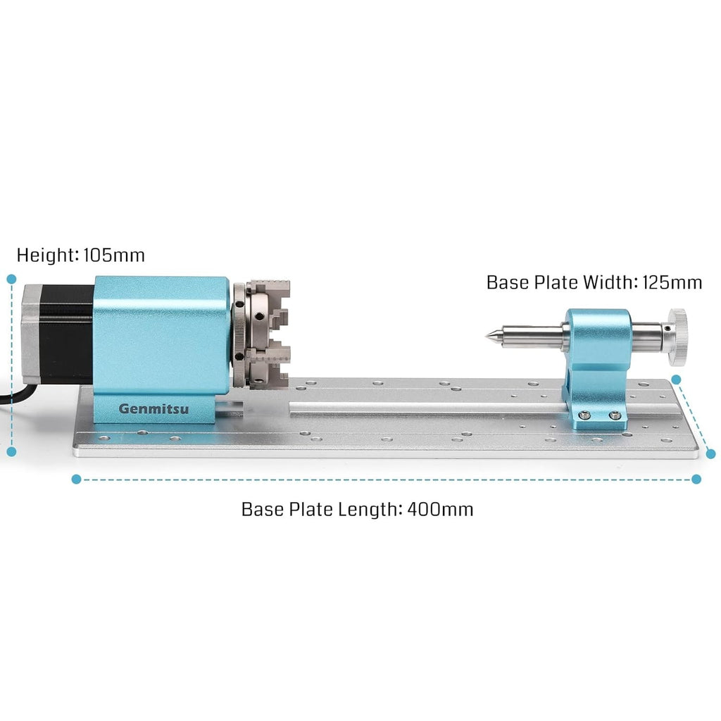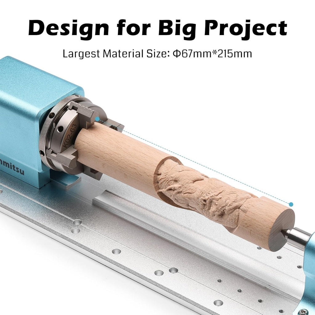 Larger Compatibility: Designed for big projects and large machines, the Genmitsu rotary module kit easily handles materials of different sizes. With a clamped material range from 15-275mm (without tailstock) to 15-215mm (with tailstock) and compatibility with 2-67mm diameters, it ensures precise engraving for industrial components, artistic creations, and detailed prototypes.
