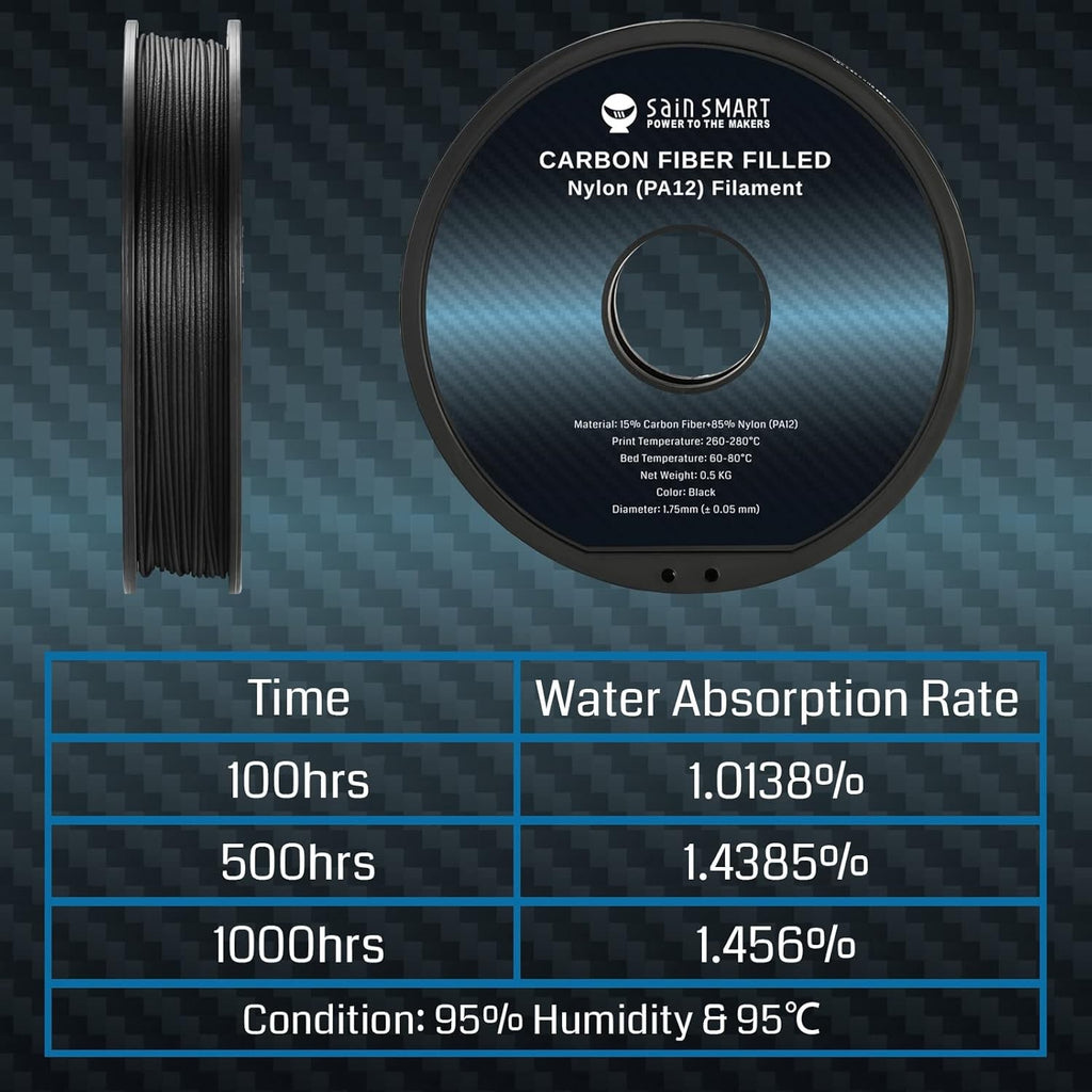 [Lowest Moisture Absorption]: An upgraded formulation of 85% PA12 + 15% Carbon Fiber, this brand new SainSmart Carbon Fiber Nylon Filament absorbs much less moisture than its predecessor. The mechanical properties and dimensional stability of which are less susceptible to the temperature and humidity of the ambient environment, providing a tough and no warp material.