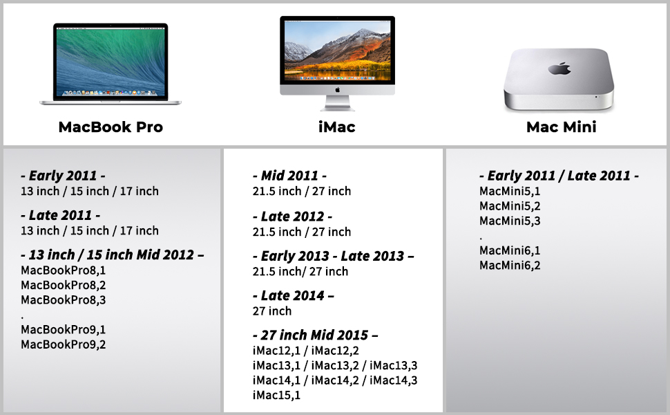 • Compatible with MacBook Pro13-inch/15-inch Mid 2012, iMac 21.5-inch Late 2012/ Early/Late 2013