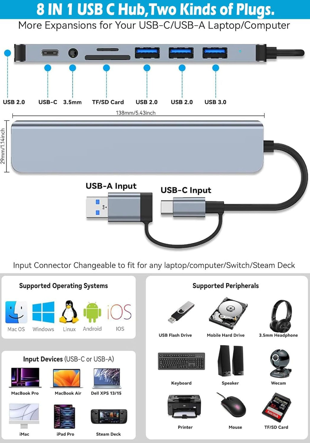 【8 in 2 Multi-Functional 】: USB C to USB 3.0 hub with 1 x USB 3.0 port, 3 x USB 2.0 ports, 1 x USB C 2.0 port, SD/TF Carder Reader and 1 x 3.5mm Audio Jack. USB 3.0, 5Gb/s transfer speed , USB and USB-C 2.0: 480 bps transfer speed, quickly transfer and download videos, music, photos and other files